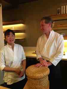 Dès que l’on pénètre dans l’ambiance tamisée de Hinoki, on est transporté en un flash dans l’une des nombreuses gargotes japonaises qui cuisinent comme personne le poisson cru. On s’attend presque à ce que les cuisiniers vous saluent d’un bruyant « bienvenu » en chœur comme les nippons font là-bas dès que vous poussez la porte d’un « bistrot » ! Mais, non, tout de même pas. Xavier et Mika n’ont pas importé ce salut surprenant jusqu’au fin fond de leur Bretagne. Mais c’est bien la seule chose qui ne vient pas de Tokyo… Le décor tout en bois laqué, teintes neutres variant du beige au noir, le grand comptoir derrière lequel on s’installe, la vaisselle raffinée et même l’habit blanc façon « kimono » du chef ainsi que ses couteaux à l’acier nippon acéré, tout vous plonge dans un japon fantasmé.